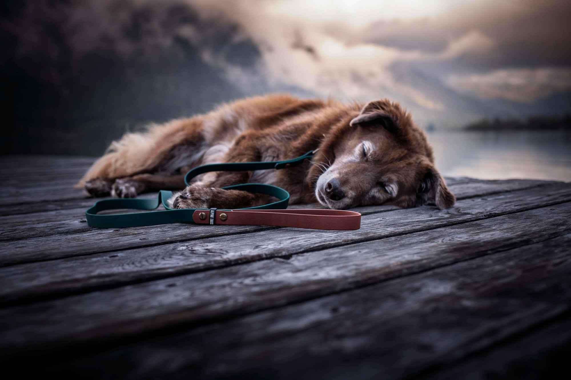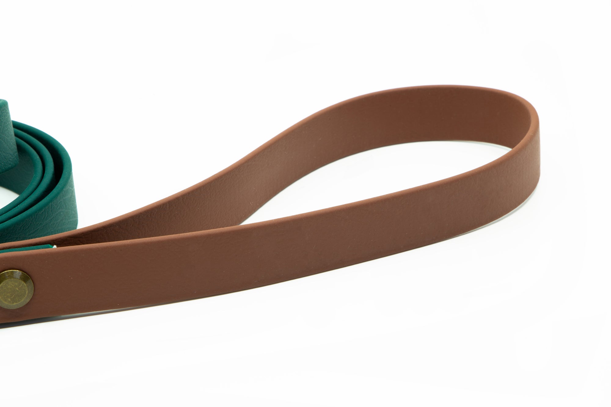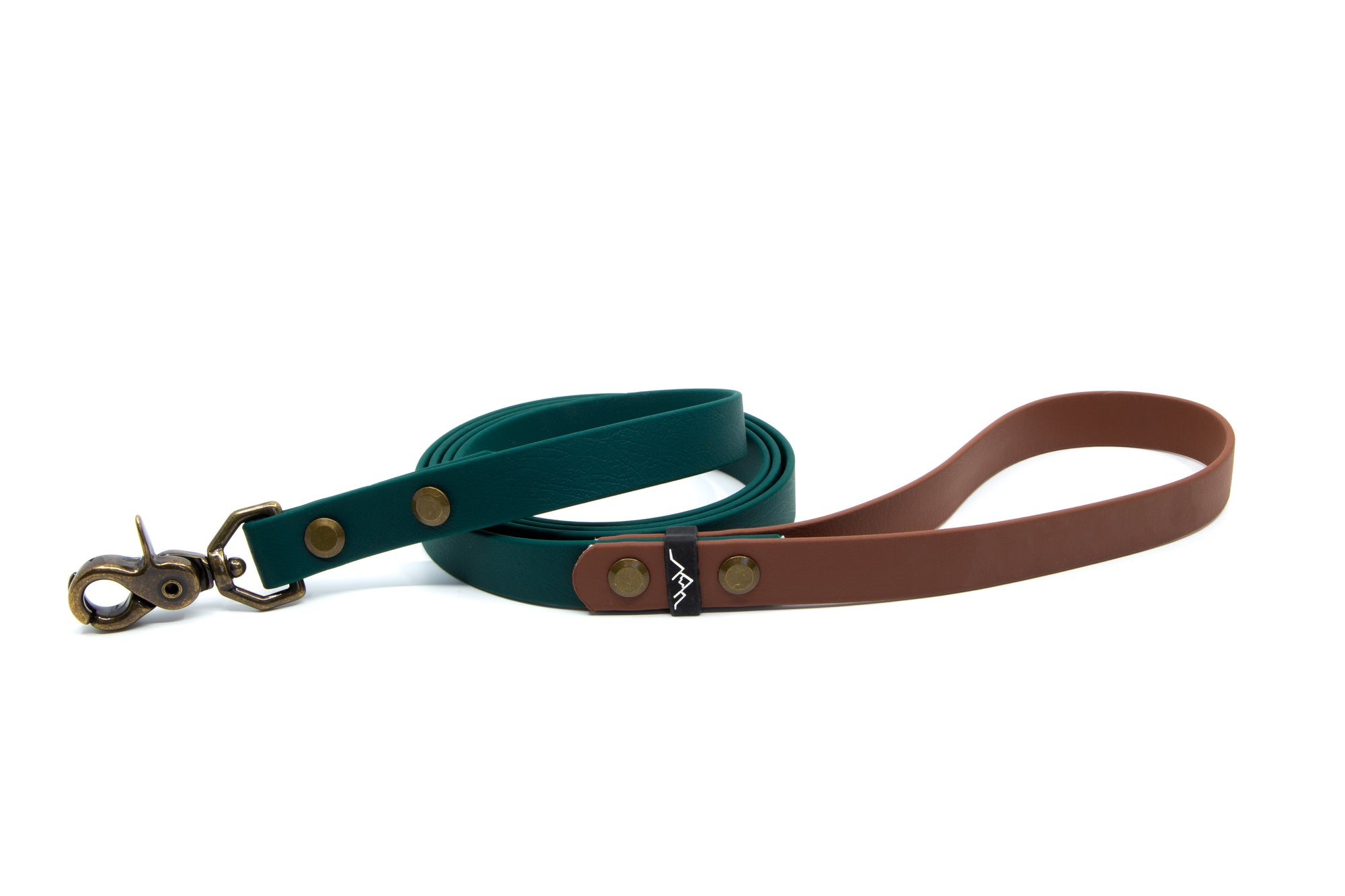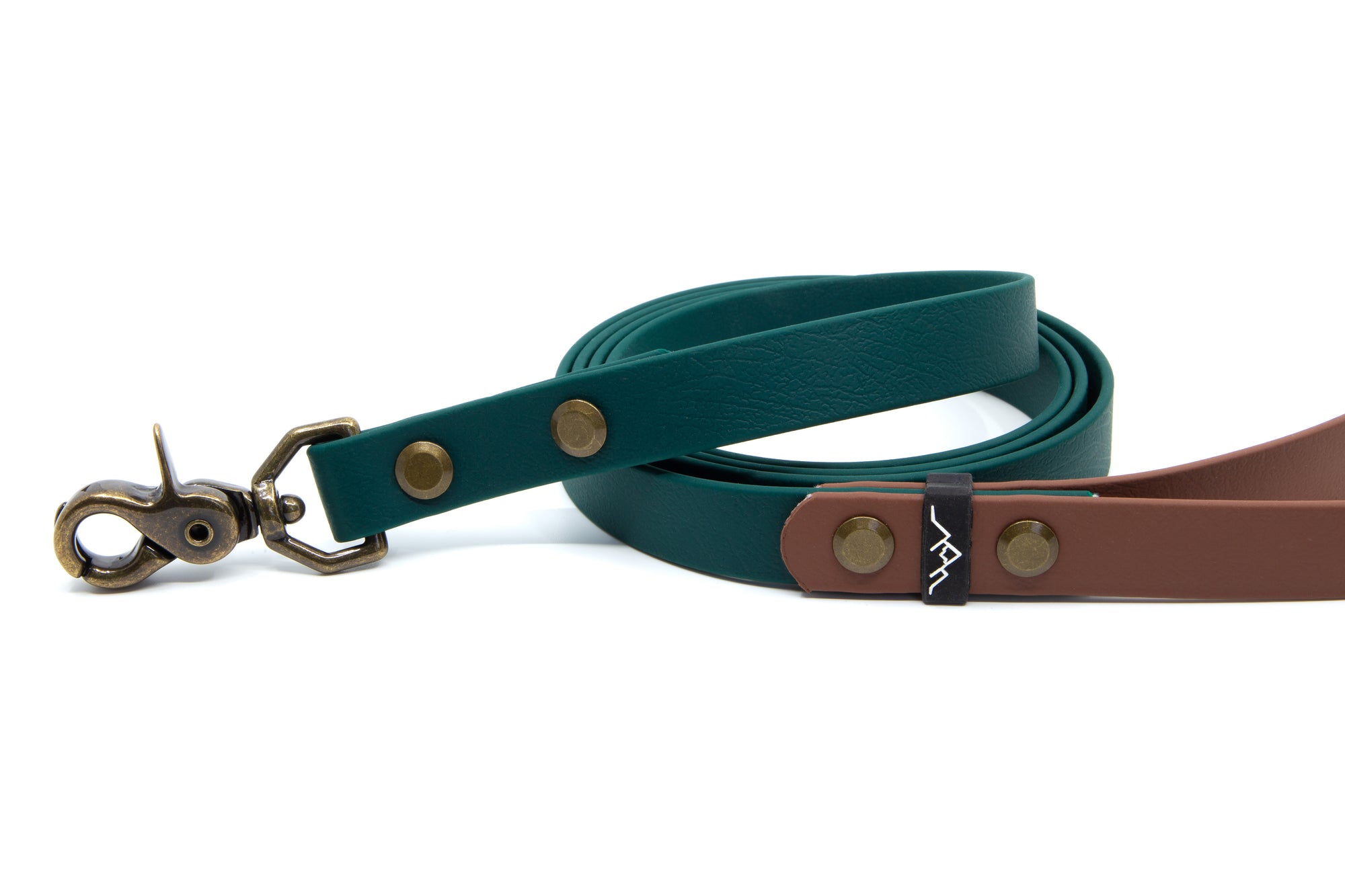 Our leashes are made out of an incredibly durable coated webbing that mimics the look and feel of leather whilst being much stronger and harder-wearing. It is 100% vegan, waterproof, stink-proof and ready for any outdoor adventure.